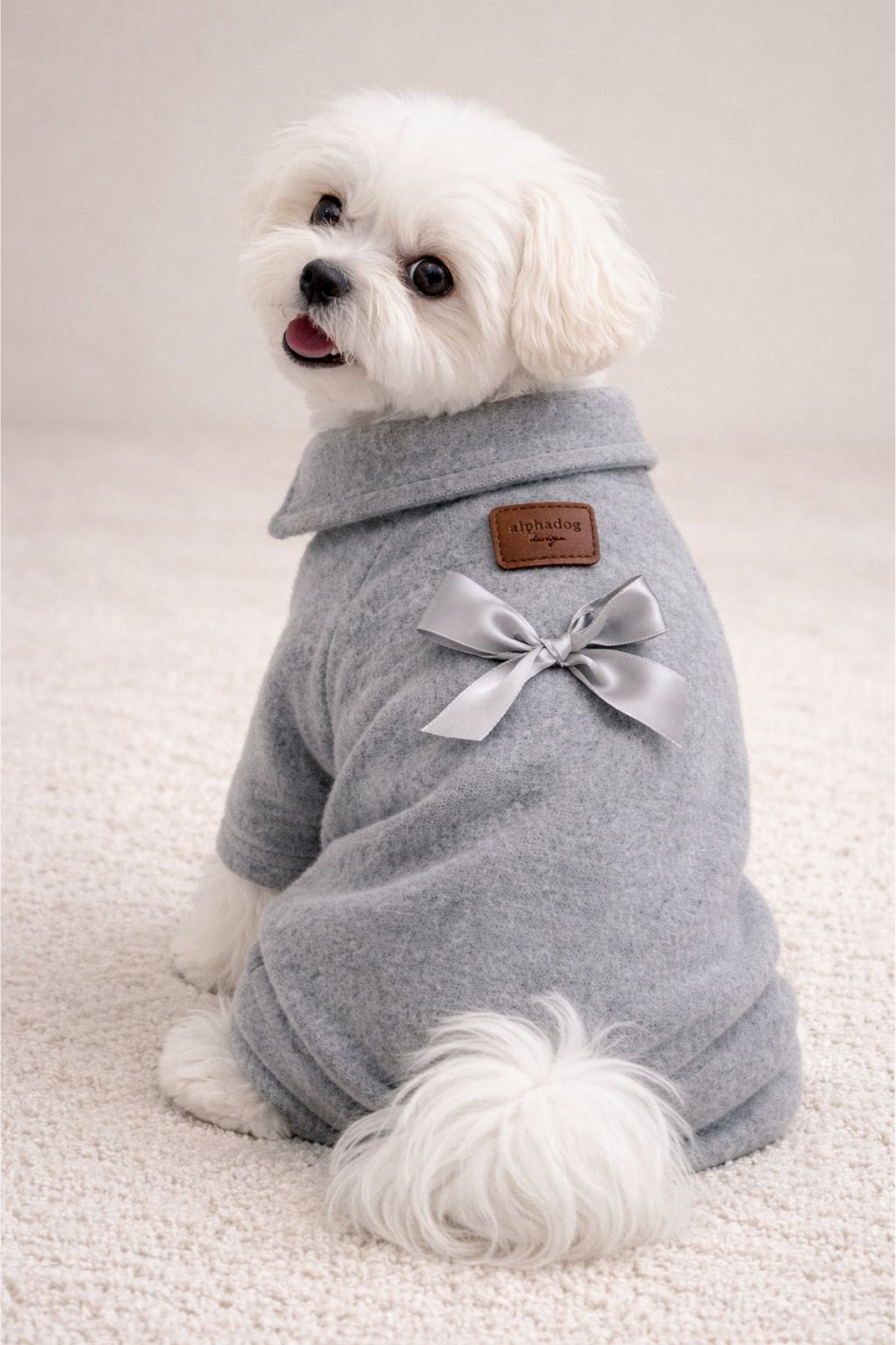 Köpeğiniz için özel tasarlanmış bu gri fiyonklu köpek tulumuyla onu hem şık hem de rahat hissettirebilirsiniz. Alphadog Design'in kaliteli kumaşlarıyla üretilen bu tulum, köpeğinizin konforunu ön planda tutar.