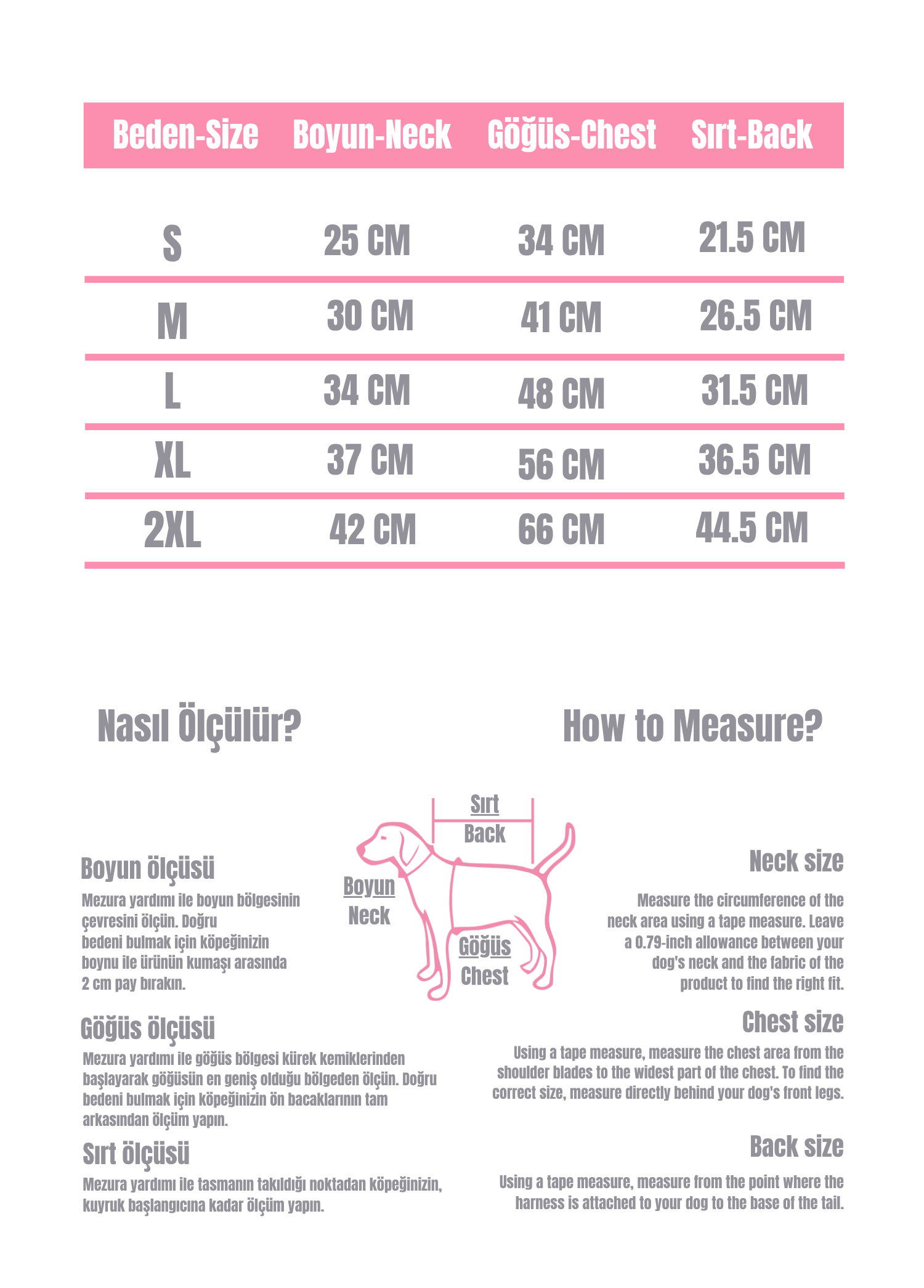 Boyut: Küçük: 9,5" Boyun, 14,2" Göğüs, 7,9" Ürün Uzunluğu