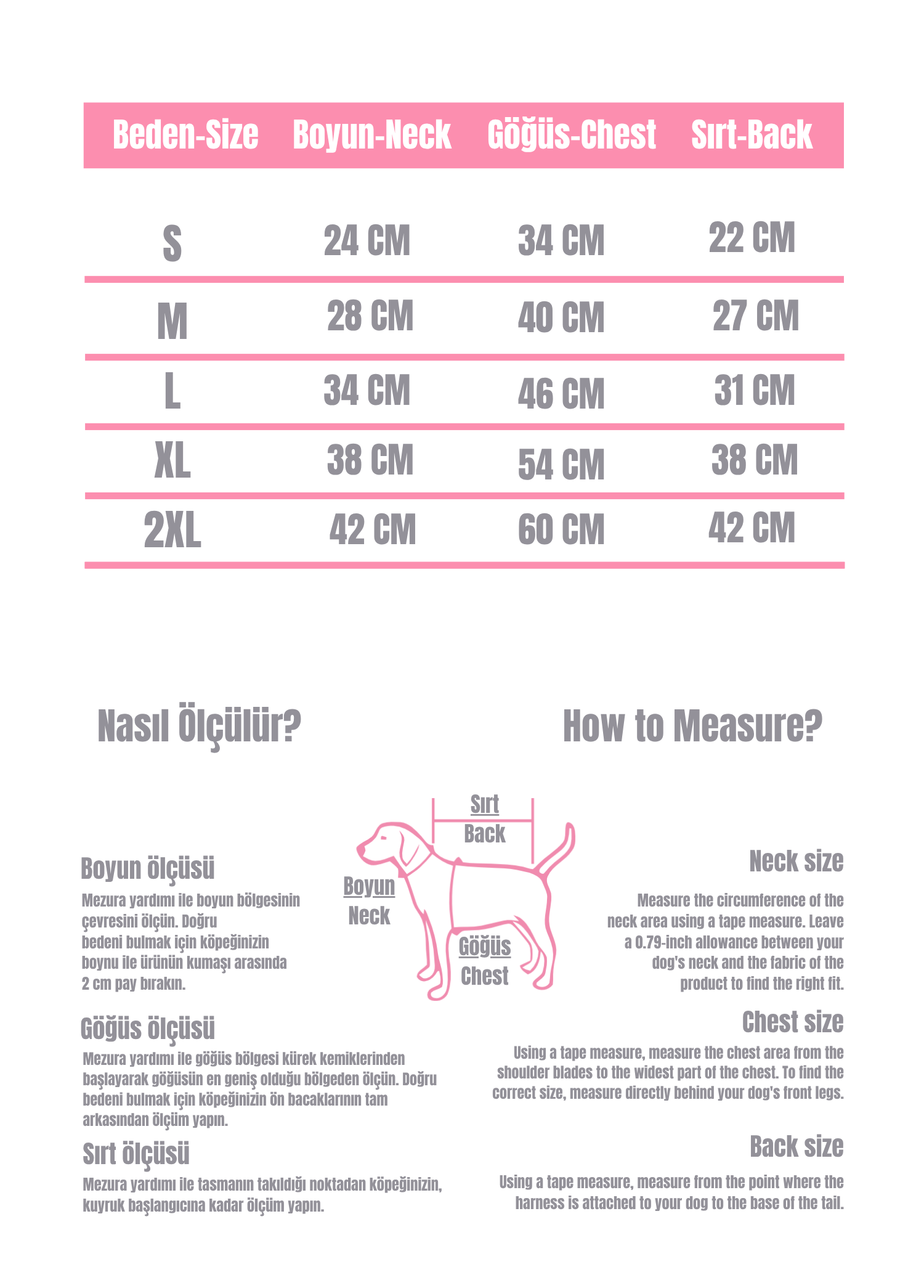 Beden: Boyun çevresi (cm): Bel çevresi (cm): Uzunluk (cm):