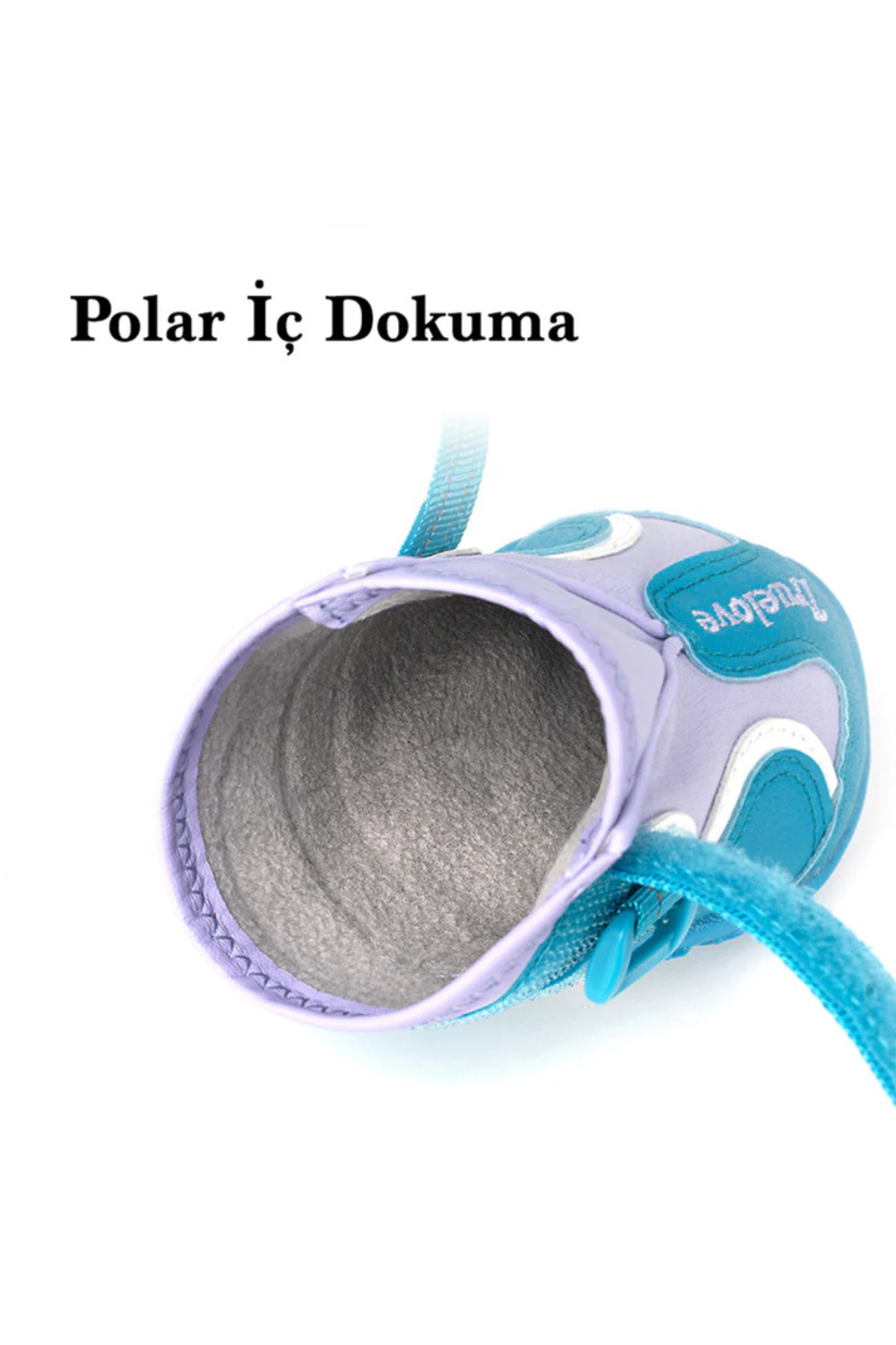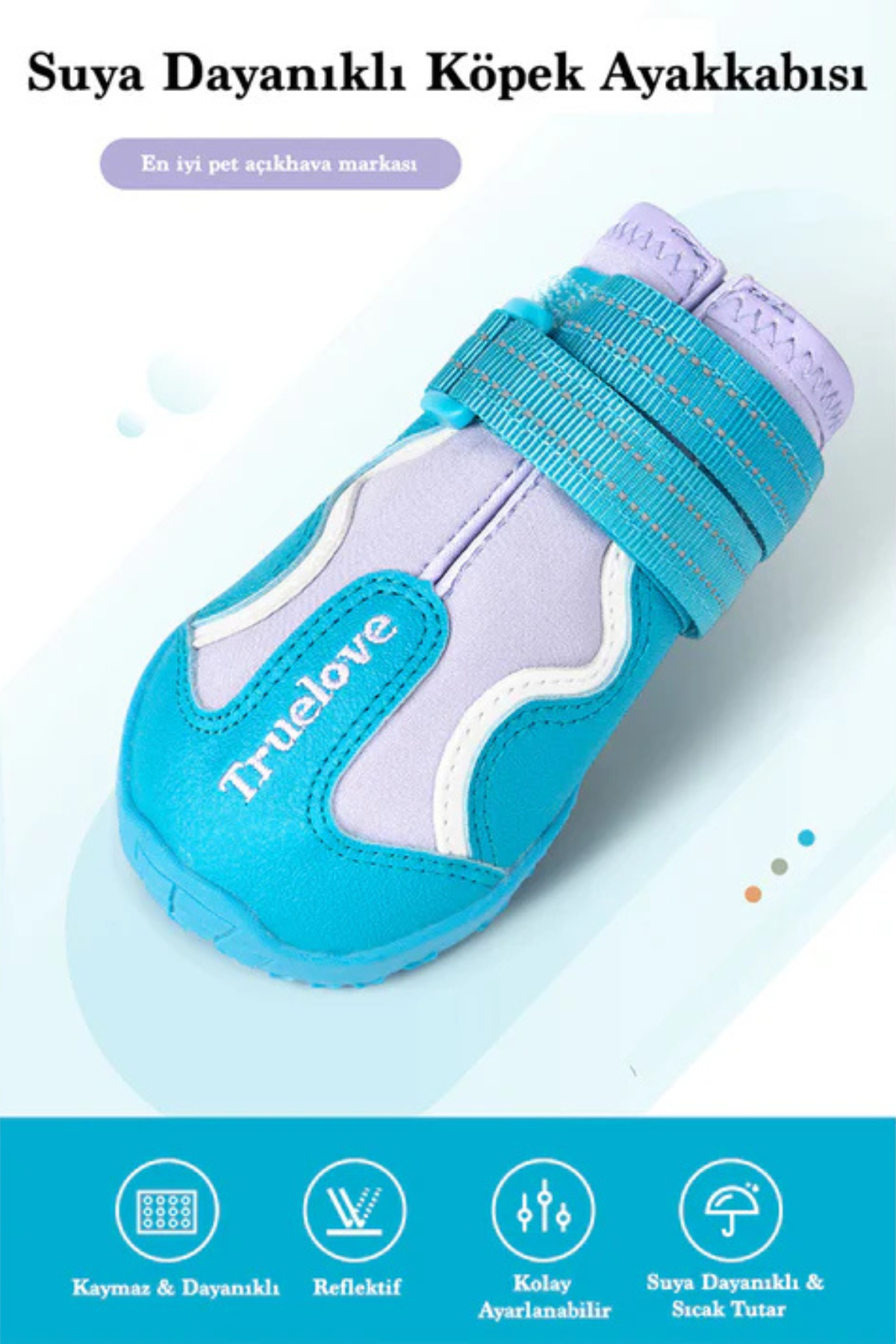 Truelove Mavi-Lila Köpek Ayakkabısı, köpeğinizin patilerini soğuk havalardan koruyan suya dayanıklı ve nefes alabilir kumaşıyla öne çıkıyor.